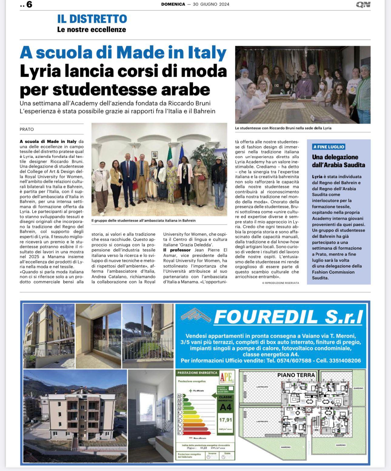 “A scuola di Made in Italy da una delle eccellenze in campo tessile del distretto pratese qual è Lyria, azienda fondata dal tex-tile designer Riccardo Bruni. Una delegazione di studentesse del College of Art & Design della Royal University for Women, nell’ambito delle relazioni culturali bilaterali tra Italia e Bahrein, è partita per l’Italia, con il supporto dell’ambasciata d’Italia in Bahrein, per una intensa settimana di formazione offerta da Lyria.”